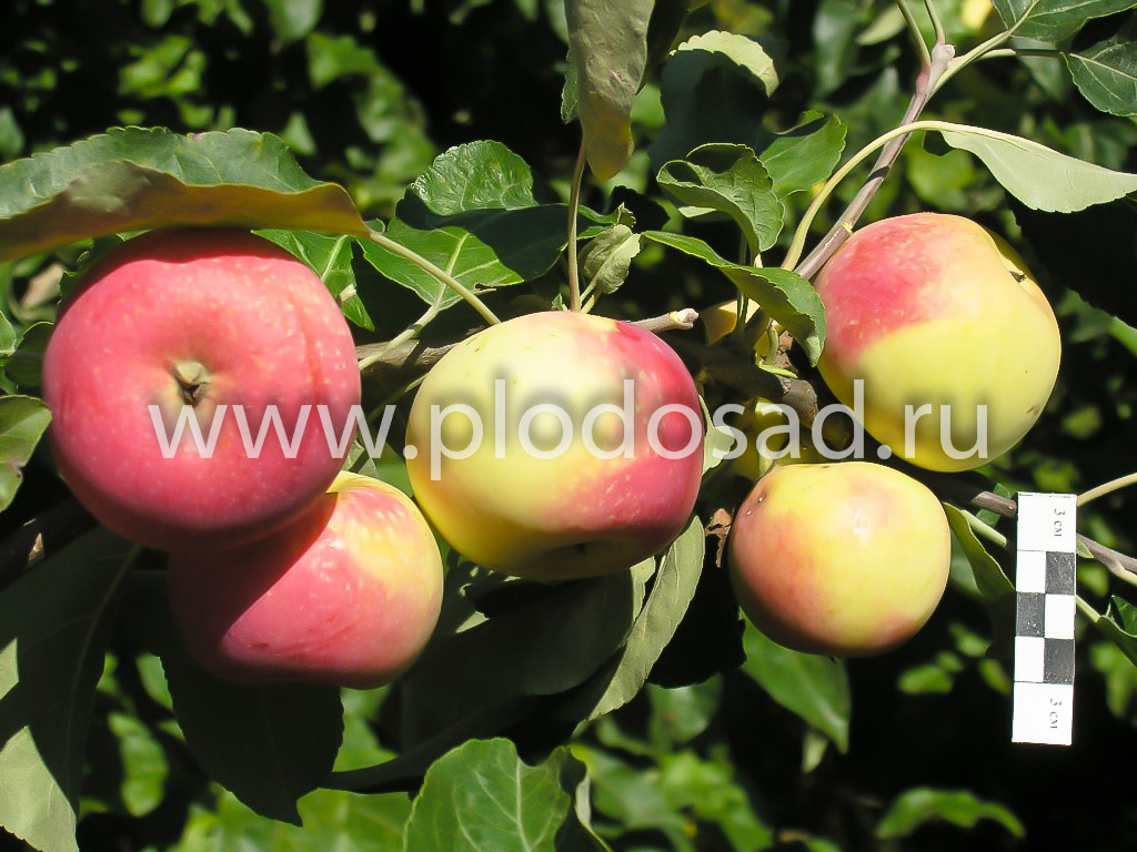 Плоды весом 67 – 80 г, округлые, кисло-сладкого хорошего вкуса с ароматом. Основная окраска яблок – светло-желтая, покровная – ярко-красная, размытая со штрихами по большей части плода, с крупными, хорошо заметными подкожными точками.